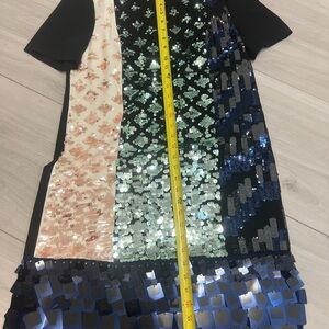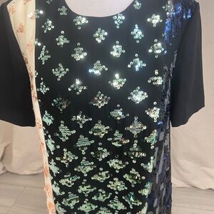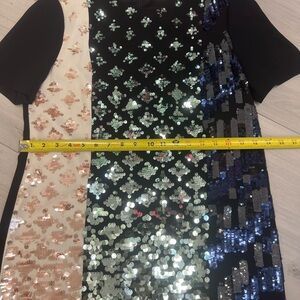Dress is 100% black polyester, short sleeves with zip up back. Front of dress is complete with sequins in color block sections. Hemline has palette squared sequins in navy and black along the navy hemline.
