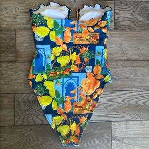 Fashion Nova Strapless Floral Citrus Print One-Piece Swimsuit - Blue/Yellow