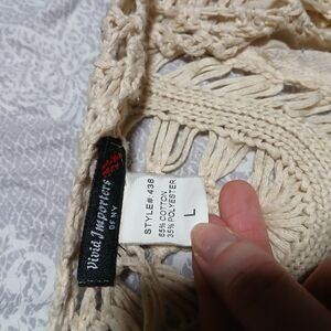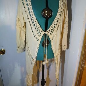 Elegant cream crochet cardigan by Vivid Impressions. Features intricate crochet patterns.