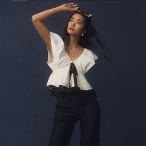anthropologie bow ruffle-sleeve babydoll blouse size L, elegant feminine zipper