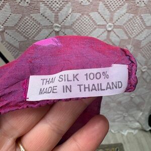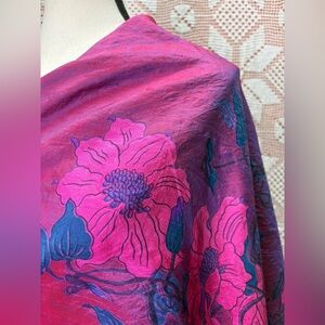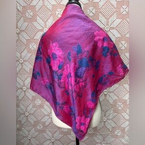 Beautiful 100% Thai silk scarf featuring vibrant pink floral print with purple and blue tones. Lightweight, soft, and elegant—perfect as a neck scarf, wrap, or hair accessory.