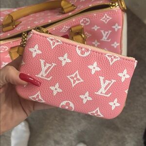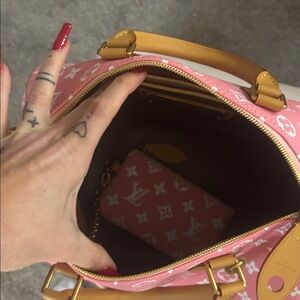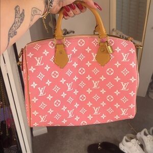 I have a basically brand new. I’ve only used it one time 30 cm pink Louis Vuitton speedy. It’s very slouchy genuine leather has gold hardware but it’s not the bright yellow gold. It’s the darker gold that’s supposed to be has the logo on the inside. The metal tag has a Crossbody strap has a small pouch that comes with it and has the lock and key it even has the lather logo on the inside of the small baby pouch on the inside of this bag it is lined in genuine leather. no lowball offers. I paid a pretty penny for this bag. It is a replica, but it is master quality. COMES W A FREE BAG CHARM 💜💜💜