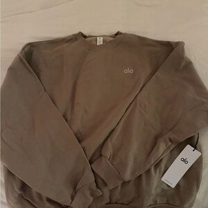 Relaxed crewneck from ALO Yoga in shade gravel. Soft-feeling fabric with minimal embroidered logo. Clean, versatile style for casual and athleisure wear.