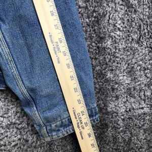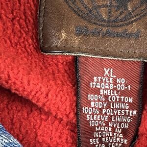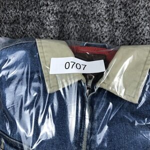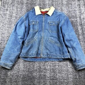 Jacket is pre-owned with cotton denim shell showing wash wear, color variation, and general use from wear and laundering. Red fleece body lining, nylon sleeve lining, front zipper, pockets, collar, and adjustable waist tabs are intact and functional. Dark stain is present on one sleeve as shown in photos, and the jacket is stored folded inside a clear protective poly bag to help maintain cleanliness during storage.