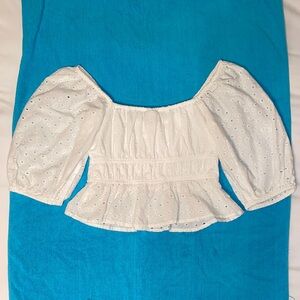 White eyelet peplum top with short puff sleeves. Square neckline with a front bow detail. Elasticized waist for a shaped fit. Lightweight, airy fabric with embroidered eyelet pattern.