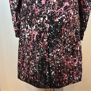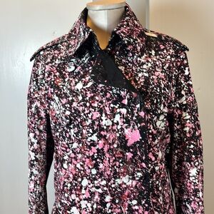 Make a statement in this eye-catching Norma Kamali trench coat featuring a bold paint-splatter design in pink, white, and black. Crafted from 100% polyester, this lightweight coat combines classic trench styling with a modern artistic twist.