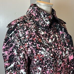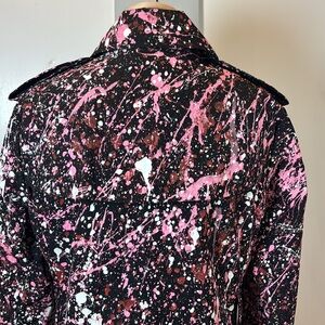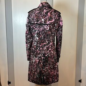 Norma Kamali trench coat, paint splatter coat, artistic print coat, women’s statement outerwear, medium trench coat, lightweight spring coat, designer trench coat, pink black white coat, trendy outerwear, street style coat, Custom Coat, Grunge, Upcycled