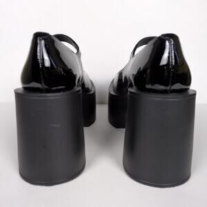 Black patent leather chunky platform Olivia mary jane style pumps with adjustable strap by Larroude. MSRP $315 Handmade in Brazil.