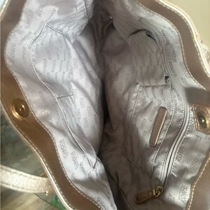 Sleek metallic tote with a subtle shimmer. Dual top handles for shoulder carry. Round MK logo accent on front. Clean, structured silhouette for everyday use.