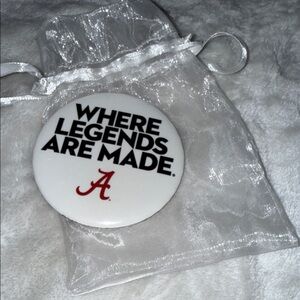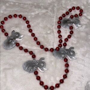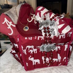 Crimson and white elephant-print tote. Includes matching crimson mesh cap with an 'A' logo. Red bead necklace with elephant charms. Great game day set. Bright team colors.