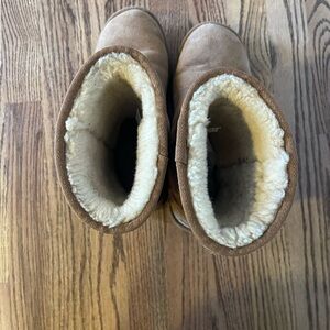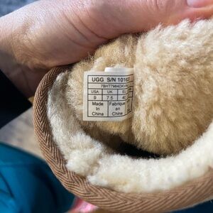 Chestnut suede UGG slippers with plush shearling lining. Slip-on ankle design. Soft cushioned footbed for comfort. Casual everyday wear.