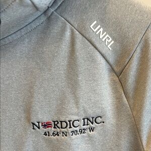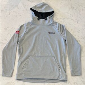 Stylish gray hoodie featuring a Nordic Inc logo and a flag patch on the sleeve. Comfortable and casual design.