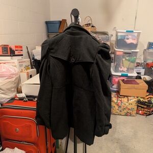 Stylish black pea coat with dramatic puff shoulders. Double-breasted front with six-button closure. Fitted waist with subtle flare at the hem. Notched lapel collar for a polished look. Smooth lined interior for comfort.