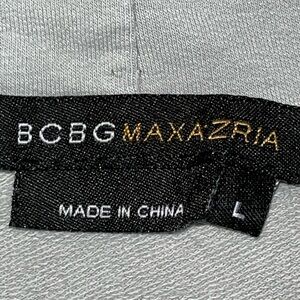 Elegant gray fabric featuring a gold BCBGMaxAzria label. Ideal for fashion enthusiasts.
