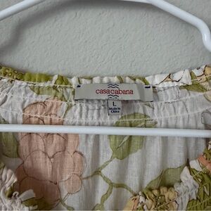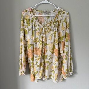 Lightweight cream peasant blouse with a soft peach floral print and olive green leaves. Smocked V-neck with tie for an adjustable fit. Flowing, relaxed silhouette ideal for everyday wear or casual outings. Feminine, easy-to-style top that pairs well with jeans or skirts.