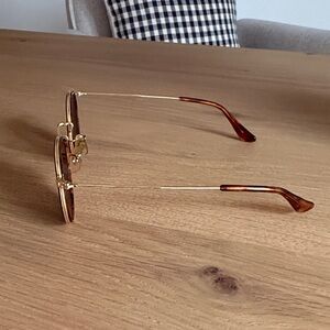 Elegant Ray-Ban sunglasses featuring gold frames and dark lenses. Perfect for a chic look. Comes with case!