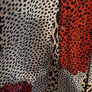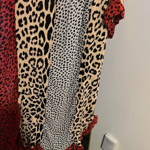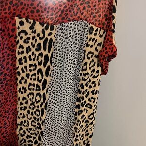 Bold animal print patchwork blouse by Umgee. Features red, cream, and black spotted panels. Lightweight and flowy fabric. Short sleeves and relaxed fit. Eye-catching mixed print design.