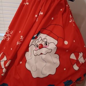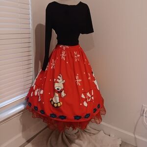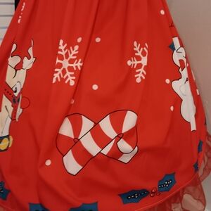 Celebrate the season with this charming red dress featuring playful reindeer and candy cane designs. Perfect for adding a festive touch to your wardrobe.