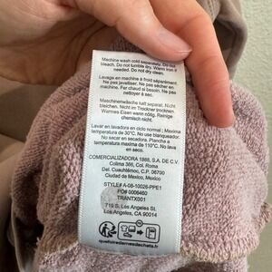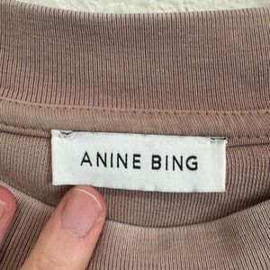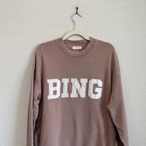 Anine Bing crewneck sweatshirt in a washed mauve or dusty rose hue provides a relaxed, oversized silhouette. This piece features a bold white "BING" varsity-style applique across the chest, adding a classic collegiate touch to the modern streetwear design. Crafted from soft 100% cotton with a French terry interior, it offers a comfortable, lived-in feel.