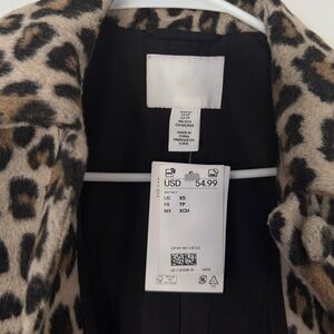 H&M pea coat with bold leopard print. Classic collar and full front closure. Structured silhouette with front pockets. Soft textured fabric for added warmth. Stylish statement piece for layering.