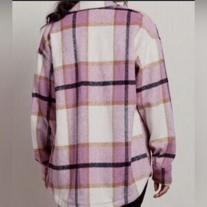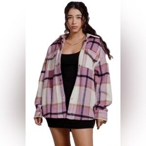 Cozy and chic Bailey Rose oversized shacket featuring a soft plaid pattern in pink, cream, and beige tones. Designed with front flap pockets and button-down closure for a relaxed, effortless vibe. Perfect for layering over dresses, jeans, or leggings for that casual yet stylish look.
