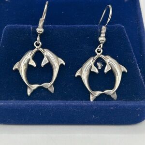 Vintage silver dolphin earrings perfect for any occasion. Stamped on back with flower makers mark and STER for sterling silver. Add a touch of 80’s coastal vibe charm to your outfit. Included will be a new silver polishing cloth to keep your earrings shiny.