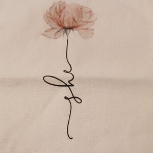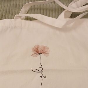 Cream colored canvas bag with single flower and scripture. Printed on both sides.