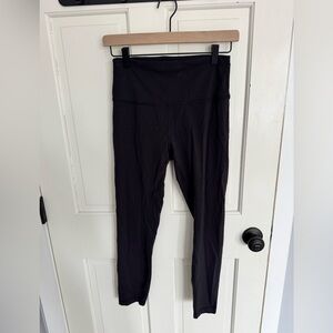 Sleek black leggings from lululemon athletica. High-rise waist for a secure fit. Soft, stretchy fabric for movement. Subtle logo at the back waistband.