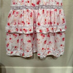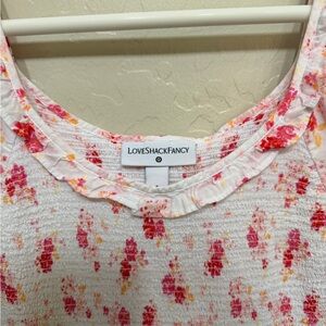 Beautiful dress for spring and summer! Delicate white dress with all-over pink floral print. Puff sleeves and a smocked bodice. Tiered ruffle skirt for soft movement. Lightweight and airy fabric. Sweet, feminine look from LoveShackFancy.