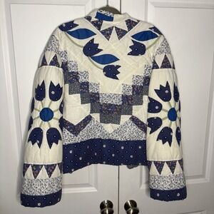 Handmade Quilt Coat Upcycled Patchwork Open Front Blue Shacket Jacket Floral