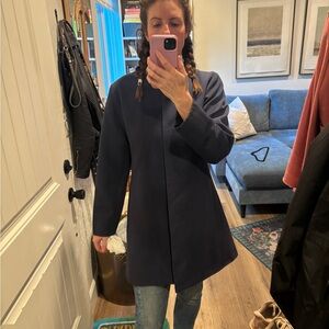 Streamlined navy vintage coat with a clean open front and pockets.Minimal collar and long sleeves. Subtle pockets for function. Versatile piece for polished layering. Barely worn - not sure exact details. Make an offer!!