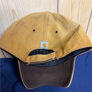 Durable Carhartt cap with contrasting tan and black panels. Features embroidered logo on inner label. Rugged fabric and reinforced stitching. Simple, utilitarian design. Signs of wear inside hat
