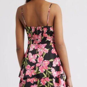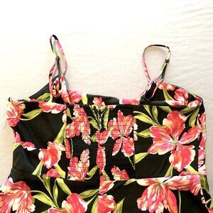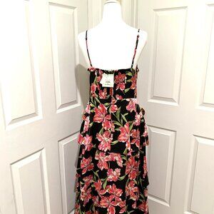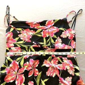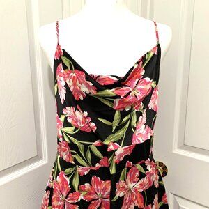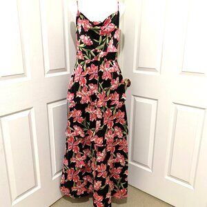 Anne Klein floral maxi dress, featuring a vibrant pink botanical print against a sleek black background. Sleeveless with adjustable straps. Draped neckline and stretchy back on the waist makes it comfortable for any occasion. Tiered maxi length. Material is very soft and flowy.