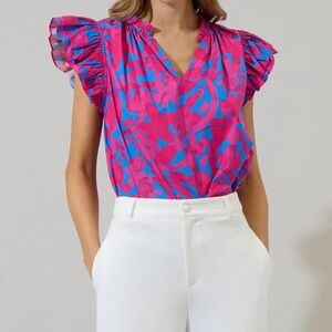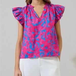 Vibrant floral print in pink and blue. Lightweight feel with flutter ruffle sleeves. V-neckline with subtle gathering at shoulders. Easy to style for day or evening looks.