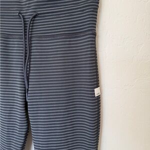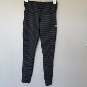 Stretchy kids leggings with thin horizontal stripes. High-rise waistband with drawstring. Soft, flexible fabric for active days. Simple neutral design pairs with many tops.