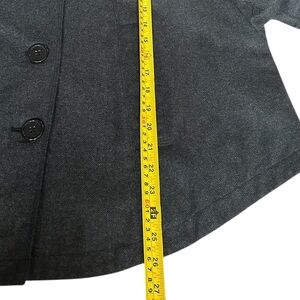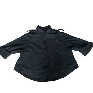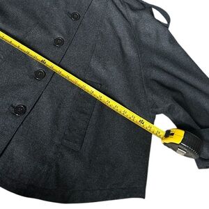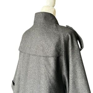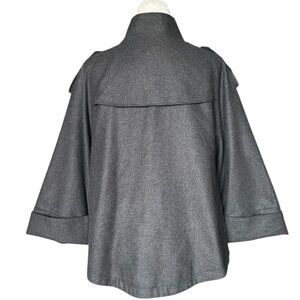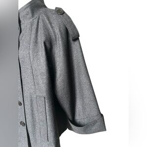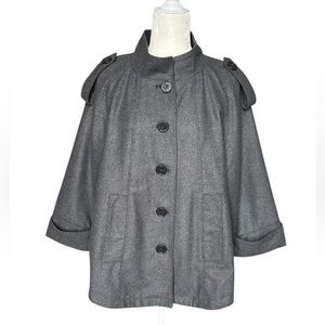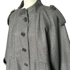 Structured gray cape coat with a front button closure. Features epaulette accents and cuffed sleeve openings for a polished look.