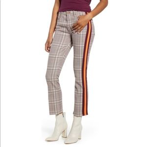 Bold stripes run down the sides of classic plaid pants with a nod to MOD updated with a cropped length and gently flared hems.