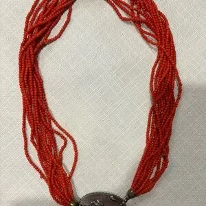 Handcrafted Red Multi-Strand Beaded Necklace with Oval Carved Elephant Pendant