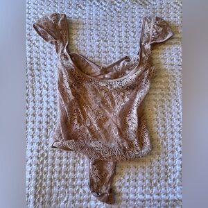 Beautiful lace bodysuit from Victoria’s Secret in a soft nude/blush tone. Features delicate floral lace, flutter sleeves, and a flattering fitted silhouette. Sheer lace design with lined gusset and snap closure.