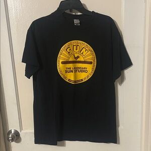 Black short-sleeve tee featuring a bold yellow Sun Studio emblem on the front. Classic crew neck and regular fit. Simple vintage-inspired graphic for fans of music history.