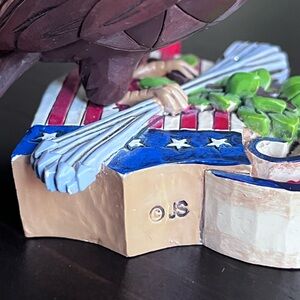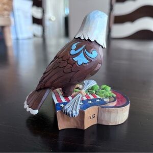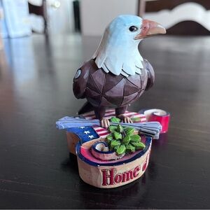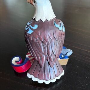 Hand-painted Jim Shore “Home of the Brave” eagle figurine. Sculpted details and patterned accents. Patriotic motif with flag-inspired base. Makes a classic display piece.