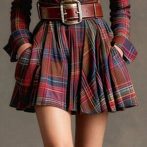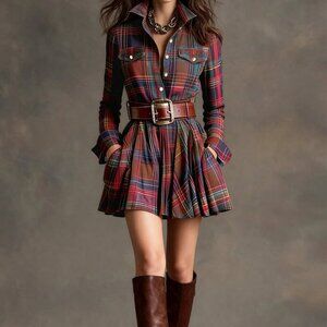 Elevate your style with this brown plaid shirt dress, featuring a collar neckline, regular sleeves, and a flared hem. It has a high waist line, cinched for a fit and flare silhouette, adorned with a gold button, and embodies elegant British style.