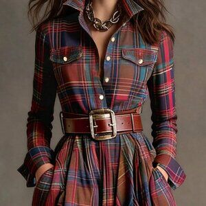Brown Elegant Women's Plaid Shirt Dress with Cinched Waist