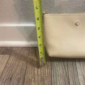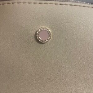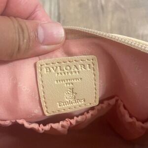 Bvlgari Parfums cosmetic bag created exclusively for Emirates Airlines. This elegant pouch features a cream or light beige faux leather exterior with a gold-tone and pink enamel logo stud on the front. The interior is lined with a contrasting salmon pink fabric and includes three elasticized slip pockets to keep small essentials organized. A secure top zip closure with a matching faux leather pull keeps items safe. Perfect for travel or as a luxury vanity organizer.
