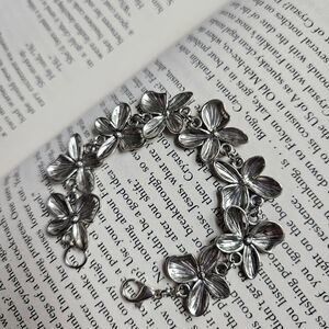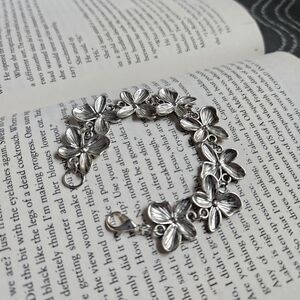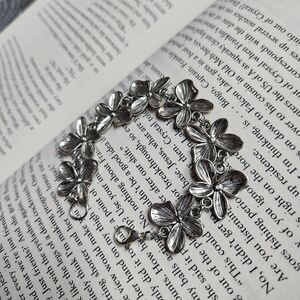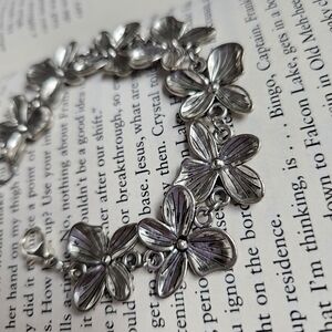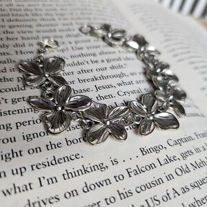 Stunning bracelet featuring a series of large detailed flower links in a beautiful antique silver finish. Each flower petal is intricately textured with raised ridges and connected with small decorative scroll links, finished with a lobster clasp closure.