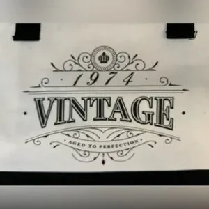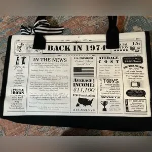 Brand new with tags. Cute vintage style design with newspaper print featuring all sorts of fun info on the year 1974. Would make a great gift for anyone born that year!
