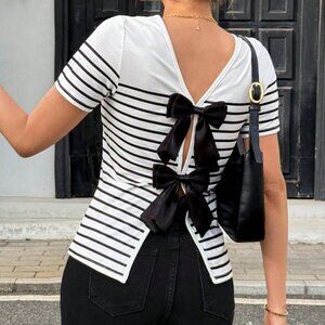 White black Casual Women's Stripe Print Backside Bow Decor T-Shirt top