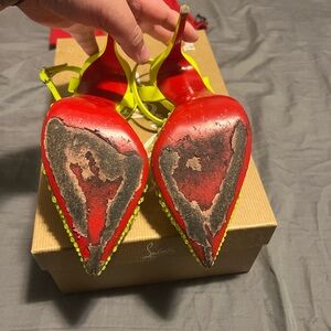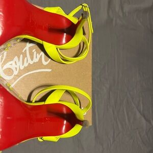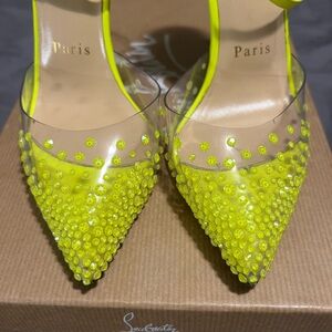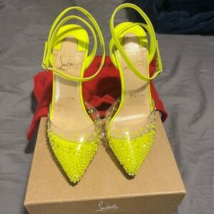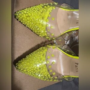 Authentic spikaqueen strass neon yellow/green pvc. Worn twice, once when it was slightly wet, hence the darker wear on the soles. Strass still perfect, nothing missing, wear on soles obviously.