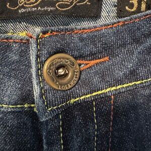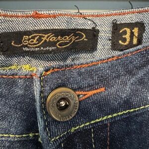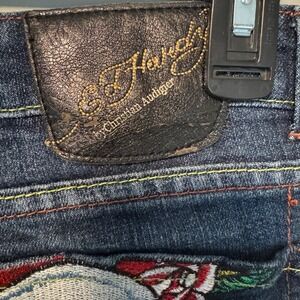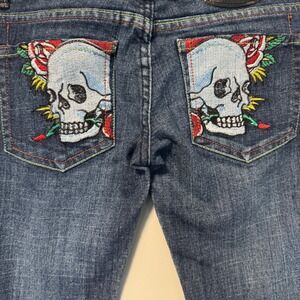 Keywords: Ed Hardy, Jeans, Denim, Skull, Rose, Embroidered, Y2K, Vintage, Designer, Size 31, Dark Wash, Slim Fit, Embellished, Christian Audigier