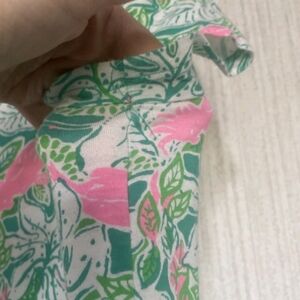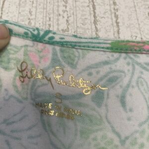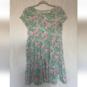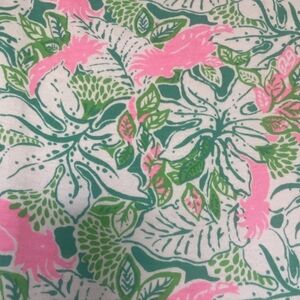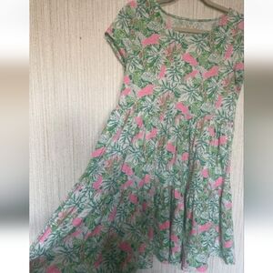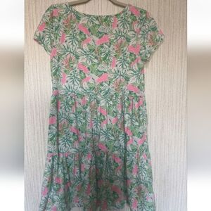 From the brand Lilly Pulitzer in a size small. I believe this is the geanna short sleeve dress. It is loose fitting and has a tiered skirt. I am not sure what the pattern is called. It is green, white, and pink. It has a fun floral print throughout with birds mixed in. It is in good pre-owned condition. It has light fading and piling under the arms, but it is not noticeable unless you are up close and looking for it. It has a ton of life left. Please review all pictures and ask any questions you may have.